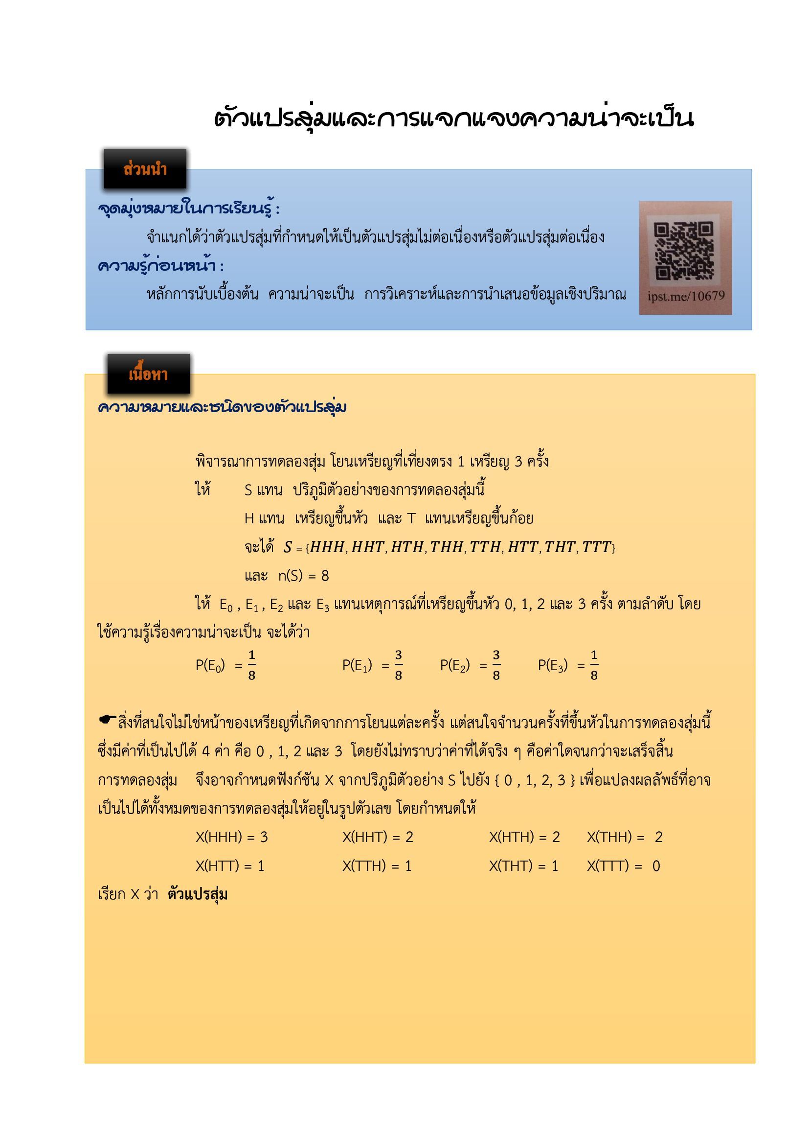 ใบงานเรื่องตัวแปรสุ่มและการแจกแจงความน่าจะเป็น (ยุวเรศ)